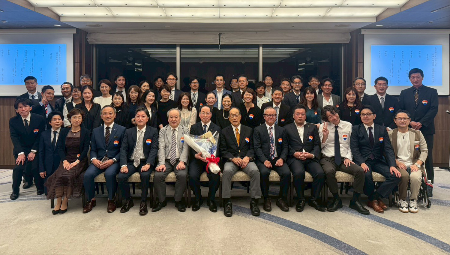 2025年10月12日,東京ドームホテルにて同期の田坂彰規君のパーシャルデンチャー補綴学講座教授就任祝賀会を,クラス会も兼ねて開催いたしました。日本近海を台風が通過する情報も飛び交うなか,遠くは沖縄,日本全国から約50名の同級生が集まり,お祝いと再会を喜ぶ会となりました。発起人の村松恭太郎君の開会の辞で始まり,同大学勤務時代に田坂君の患者さんに対する真摯な振る舞いが厚い信頼を得ていたエピソードを紹介されました。小川勝生君,小川志保君の流麗な司会のもと,会はスムーズに進められました。次に学年主任をしていただいた内山健志名誉教授からご挨拶を賜り,我らが108期生が現役国家試験合格率100%であったことを誇らしいと語られ喜んだ直後,「ところで君らは幾つになったんだい?」と22年後の現実をいきなり突きつけられて会場から思わず笑いが起こりました。思えば当時も内山教授の和やかな雰囲気の激励でいつも試験前の緊張感を解いていただいたなと,とても懐かしく思い出されました。