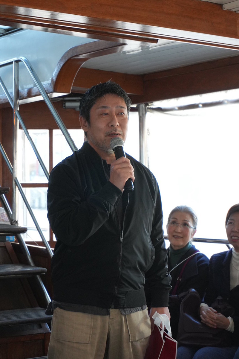 当日,晴天に恵まれたこの日,私たちのクルーズは,午後3時に日の出桟橋を出港し約2時間,相原先生の流暢な司会のもと,同期で早くも亡くなられた先生へ,哀悼の意を表すための黙祷を出席者全員で行い,その後中村先生の開会,大学時代,私たちの恩師であられた佐藤 亨先生のご挨拶並びに乾杯のご発声により,待ちに待ったクラス会が始まりました。