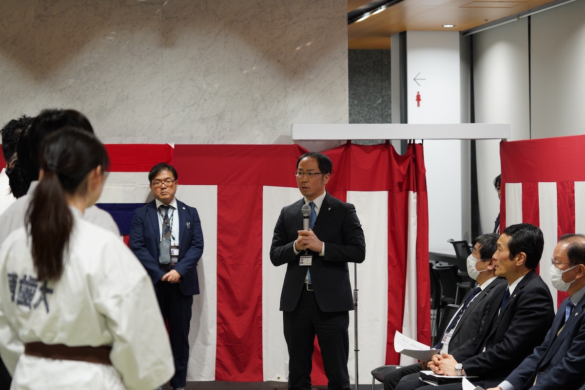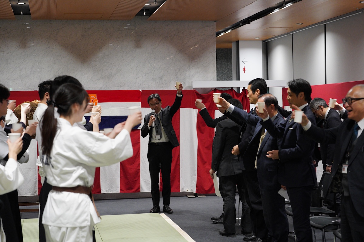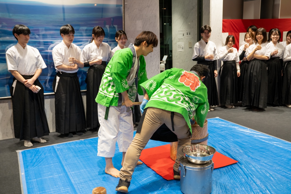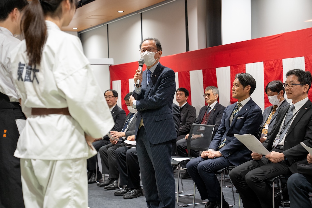 2026年1月9日(金)18時より,東京歯科大学水道橋校舎本館西棟1階ラウンジにおいて,令和8年武道始めが開催された。片倉 朗学長,田坂彰規柔道部部長による挨拶の後,現役学生による演武が披露され,校歌斉唱が行われた。武道始め終了後には,鏡開きが行われた。山本 仁副学長からの挨拶の後,各部主将による決意披露がなされた。山下秀一郎副学長による乾杯の挨拶の後懇談会となり,きなこ餅や磯辺焼きが振る舞われ,関係の教職員も交えて楽しい交流の場となった。